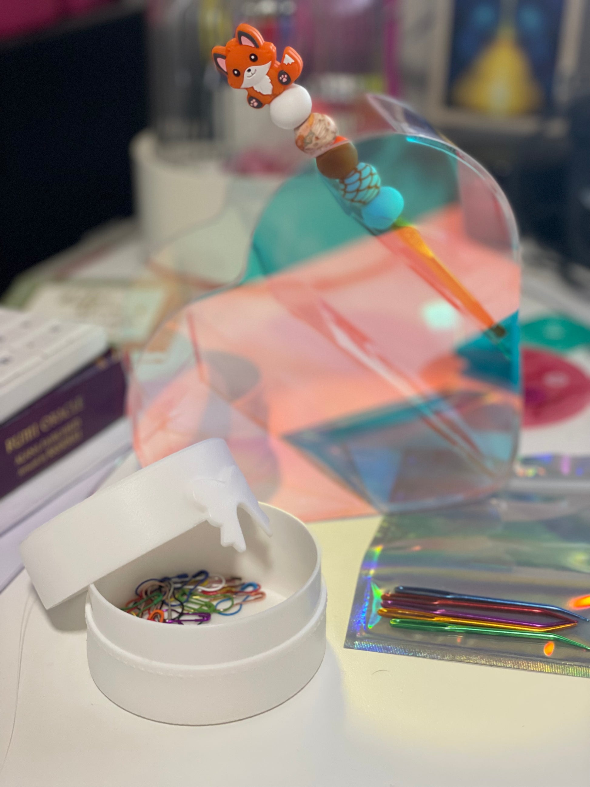 A practical-meets-pretty setup with an iridescent love-heart desk caddy — the perfect spot for hooks, scissors, pens, and crafty bits.